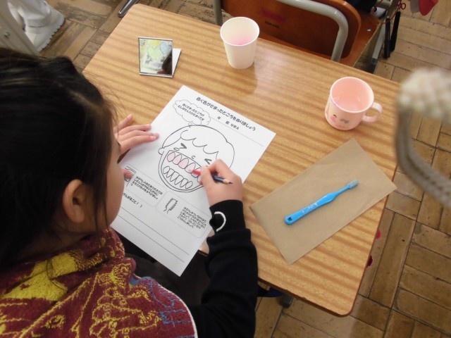 後半は、自分の歯で染め出しを行い、どのくらいきれいに磨けているか確認しました。