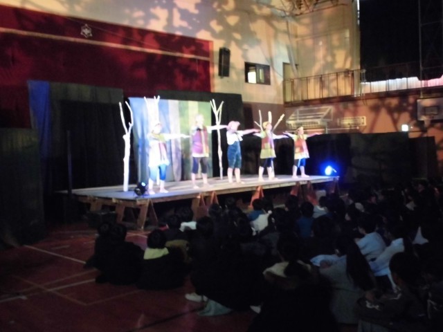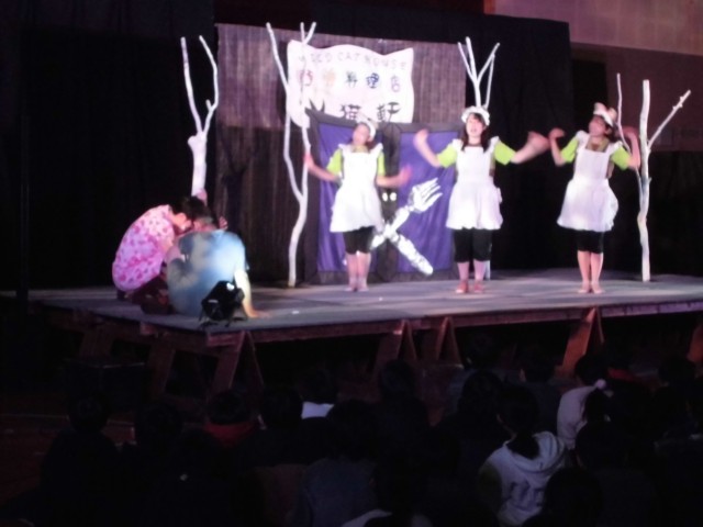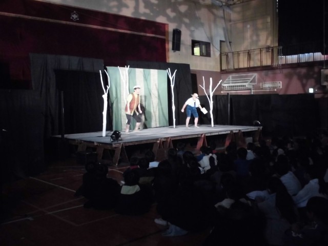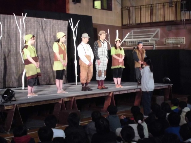 劇のお話は宮沢賢治の「どんぐりと山猫」と「注文の多い料理店」でした。宮沢賢治の作品なので、内容がちょっと独特の世界観で不思議なものでしたが、劇団の人の声の響きや本物の演技を見た子どもたちは、きっと何かを感じたことと思います。