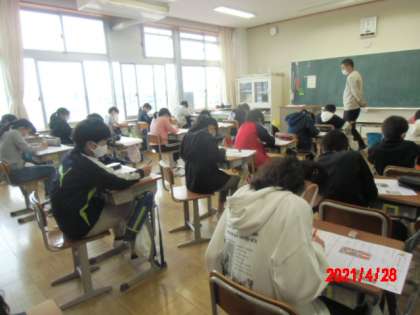 1組、2組は国語のテストをしていました。3組は、英語で外国のことについて知ろうというテーマで学習していました。