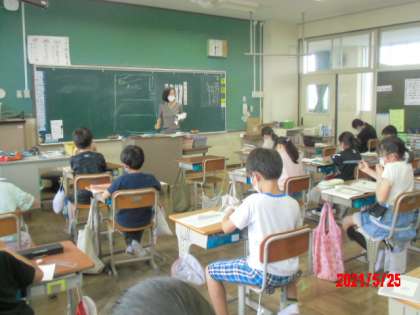 4年2組は国語(読書新聞を書こう)、5年1組は社会のテスト(国土の地形の特色)、5年2組は体育で元気に活動していました。