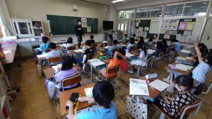 2年2組の「国語」です。「えいっ」という物語について登場人物の気持ちを想像しながら、自分の考えをノートに書いたり、友達と交流したりしていました。