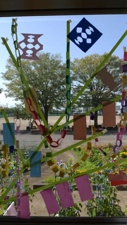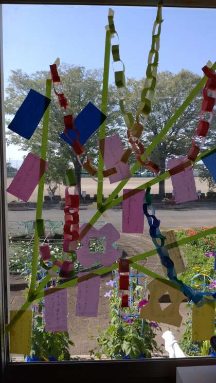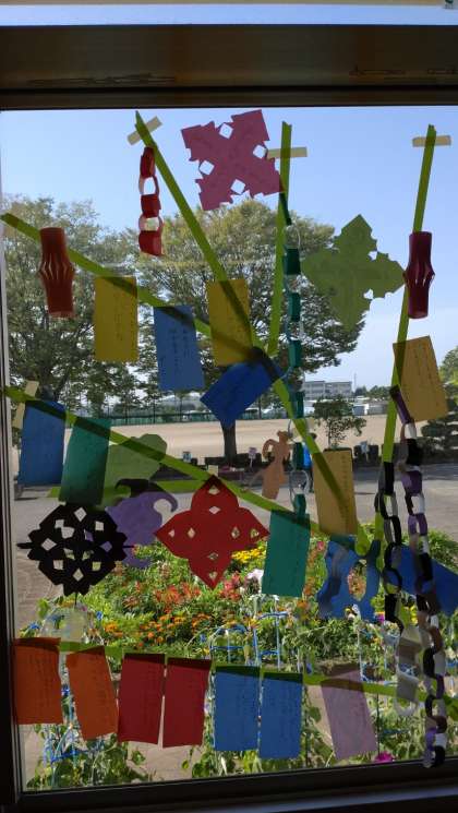 ある教室の窓には、願いの書かれた短冊が飾られていました。