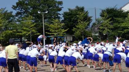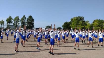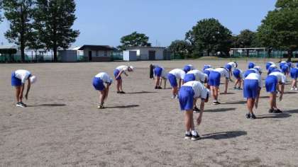 朝体操の終わりに、先生から「こまめに水分補給をして、熱中症に十分気を付けましょう」