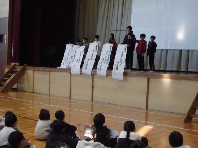 本日(12日)の児童集会は、図書委員会の発表でした。 図書室に関するクイズを出...