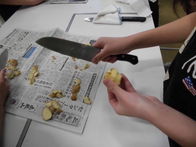 11日は、6年生が合同の家庭科で、じゃがいもの皮むきを行いました。 定規を使っ...
