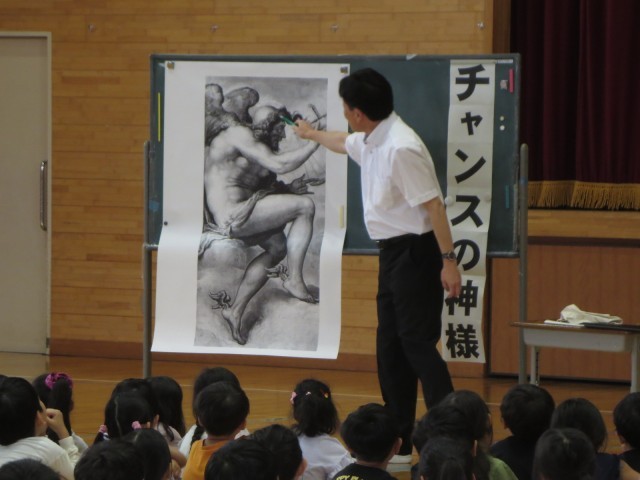 校長からの話では、秋は自分の持ち味や特技を発揮できるチャンスがたくさんあることから「チャンスの神様」の話をしました。