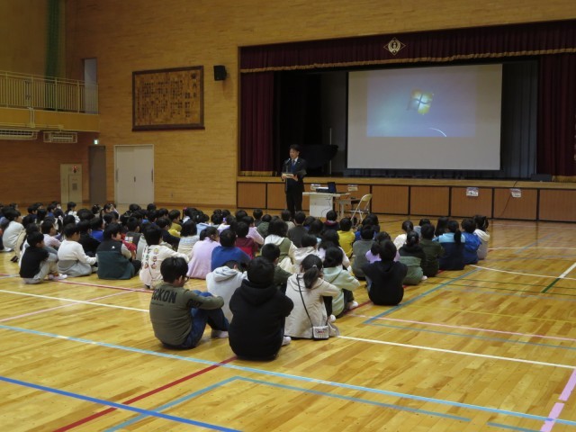 朝行事で人権講話を行いました。