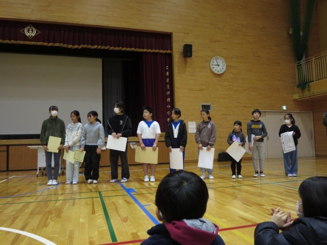今日は、読書感想文コンクール、理科研究作品コンクール、県小学校陸上教室記録会、税に関する絵はがきコンクールの入賞のみなさんです。