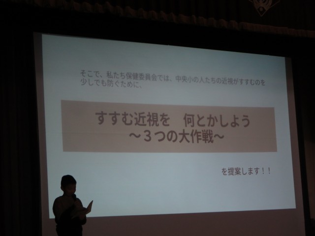 10月に行った目の健康に関するアンケートの結果を受け、保健委員会では、中央小の子供たちの近視がすすむのを少しでも防ぐために「すすむ近視をなんとかしよう~3つの大作戦~」を考え、発表しました。