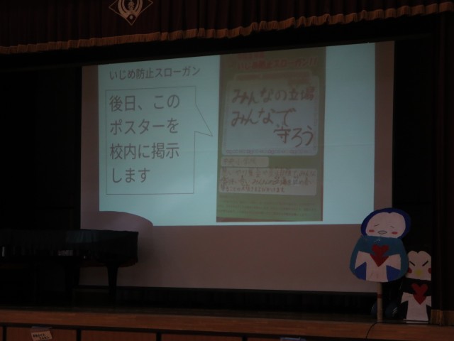 その後、これから1年間の中央小のいじめ防止スローガンを発表がありました。スローガンは「みんなの立場 みんなで守ろう」です。