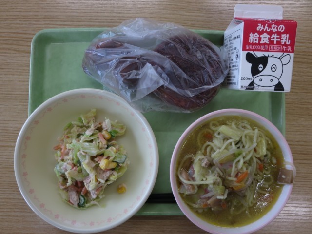 メニューは、ココア揚げパン、牛乳、塩ラーメン、ツナサラダです。