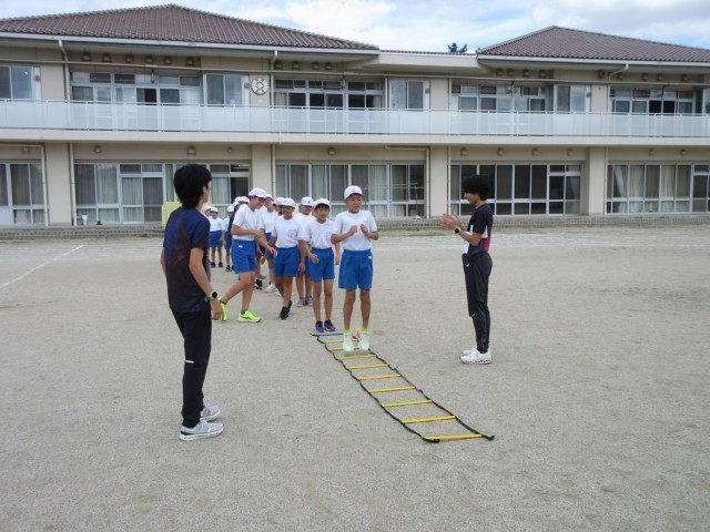 準備体操の後、6グループに分かれてラダー等さまざまなトレーニングを行い、