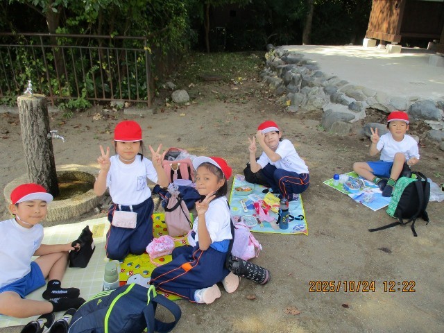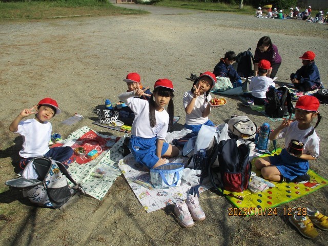 遊園地や動物園での活動と同様、班ごとにレジャーシートを寄せ合って食べました。動物園の見学の最中に「おなかすいたー」「お弁当の時間まだー?」という声が聞こえており、子どもたちが、おうちの方が作ってくれたお弁当を食べるのを待ち遠しく思っている様子が見られました。いざ自分のお弁当を開けたとき、大好きなおかずを頬張ったときには、みんながうれしそうな表情を浮かべていました。