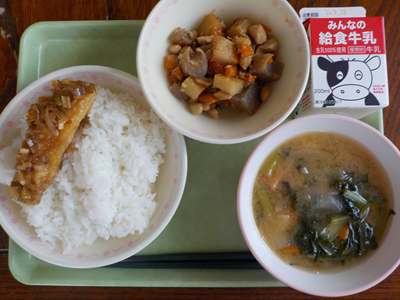 ご飯、牛乳、白身魚薬味ソース、五目豆、青菜のみそ汁