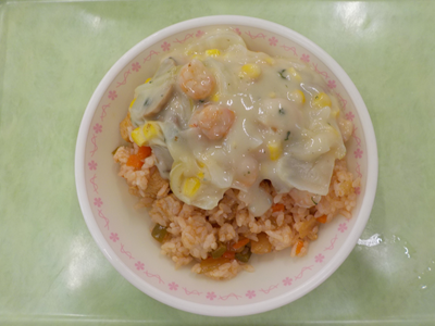 チキンライスえびドリアソース(ご飯、チキンライスの具、えびドリアソース)、牛乳、マカロニスープ