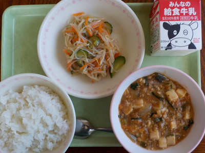 ご飯、牛乳、マーボー豆腐、春雨サラダ