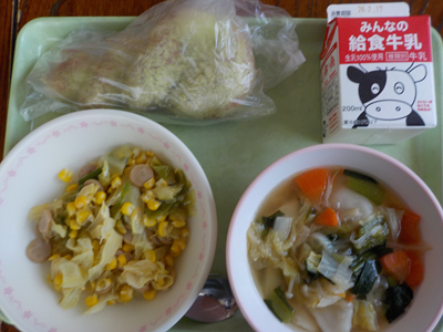 うぐいすきなこ揚げパン、牛乳、餃子スープ、キャベツとコーンのソテー