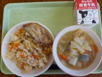 2/4(水)献立キムチご飯(ご飯、キムチご飯の具)牛乳、たら青のり竜田、里芋のみ...