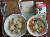2/17(火)献立黒食パン、牛乳、ジャーマンポテト、カレースープ、スライスチーズ