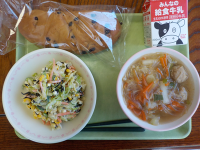 2/19(木)献立チョコチップパン、牛乳、白菜と肉団子のスープ、ひじきマヨサラダ