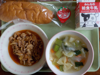 2/26(木) 献立はちみつパン、牛乳、豚肉のワインソース煮、リボンスープ、一口...