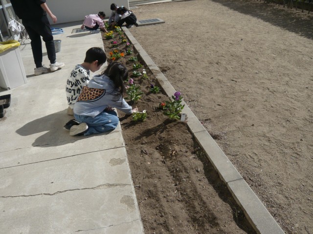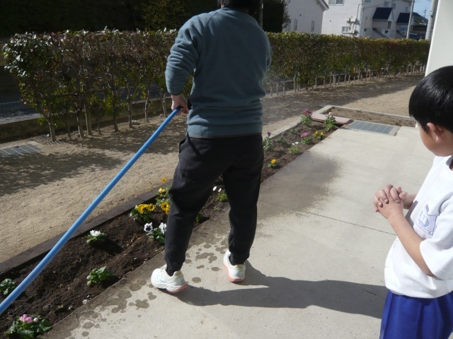 1月28日(水)、1年生の花壇には、きれいな花がたくさん植えられていました。子どもたちが「この花、かわいい、かわいい」と優しく声をかけながら土を触り、植えていました。やさしく素直な子どもたちの気持ちが言葉に表れていました。