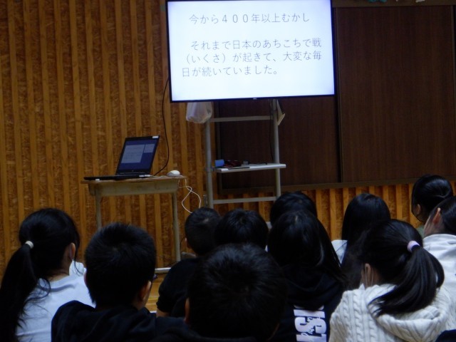 今週27日の木曜日、5年生が地域の行事「例幣使仮装行列」に参加します。今日は事前学習で、先生方から、いつ頃から始まった行事なのか、昔どんな出来事がこの韮川の地で起きていたのか、説明がありました。