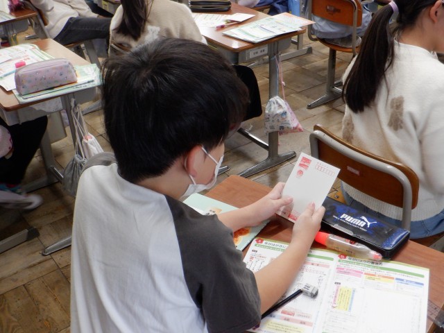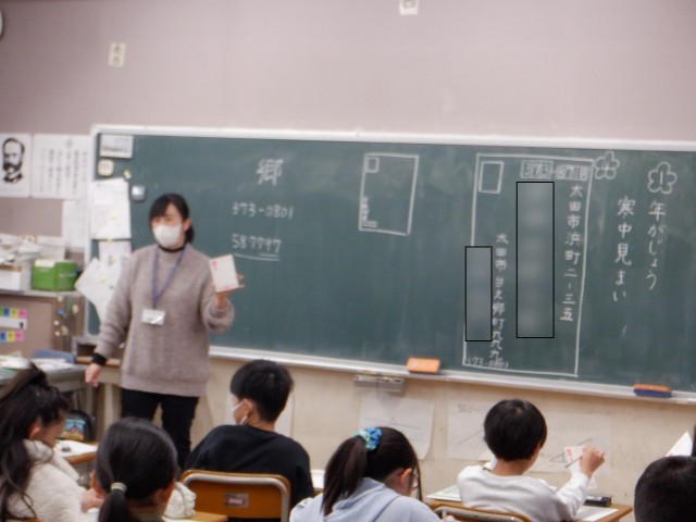 今日は4年生が「年賀状の書き方」を学習しました。郵便局の協力を得て、児童一人ひとりに年賀状が1枚ずつ配られました。はがきを書く機会は減っています。こんな気持ちの伝え方もあるんだと、知っておいてほしいものです。