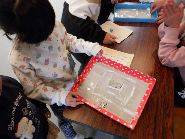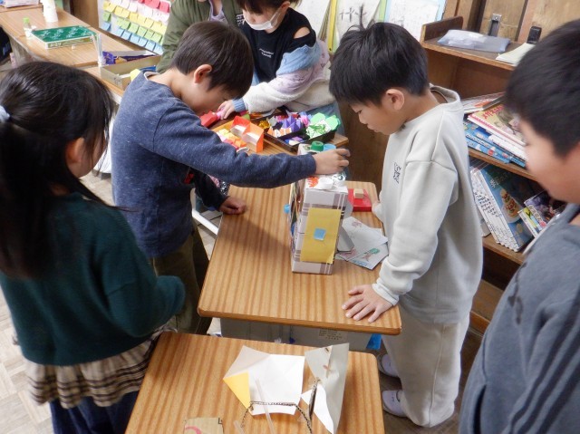 2年生が、やさしくおもちゃの遊び方を教えていました。それを聞いて遊ぶ1年生はとても笑顔で楽しそうでした。