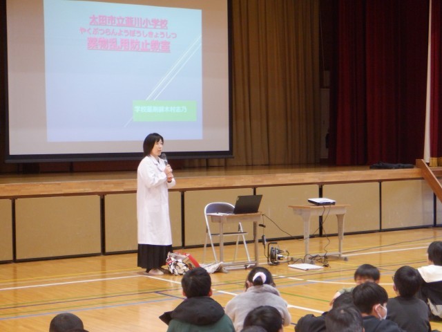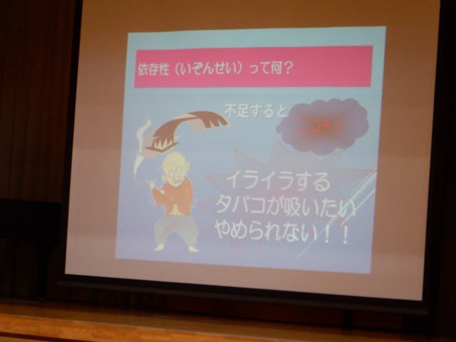 学校薬剤師さんを講師でお招きして、たばこの害、飲酒の害、薬物の種類と害についてお話しいただきました。
