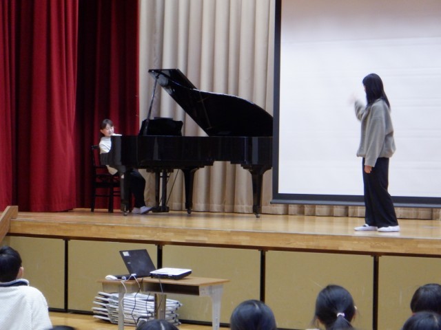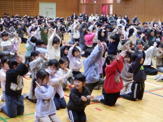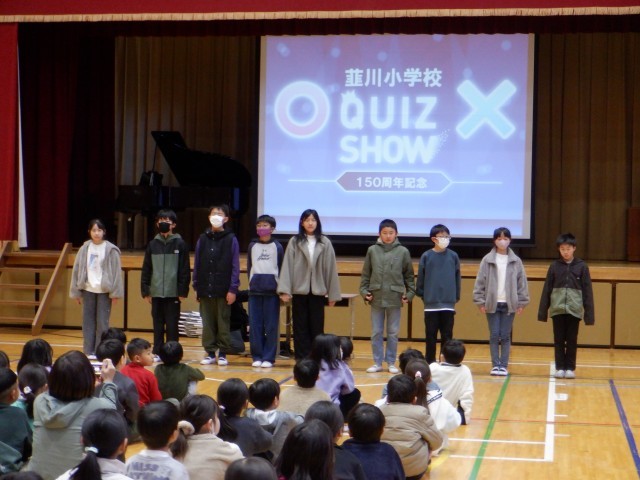 今日は、韮川小学校の創立150周年記念集会を行いました。全児童と地域や保護者の方々にも見に来ていただきました。児童の指揮と伴奏で校歌をうたった後、韮川小にまつわるクイズを行いました。