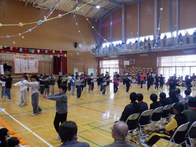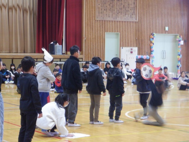 6年生との登校班での出来事や縦割り班でドッジボールの様子をコント仕立てで発表した後、全員でダンスをしました。