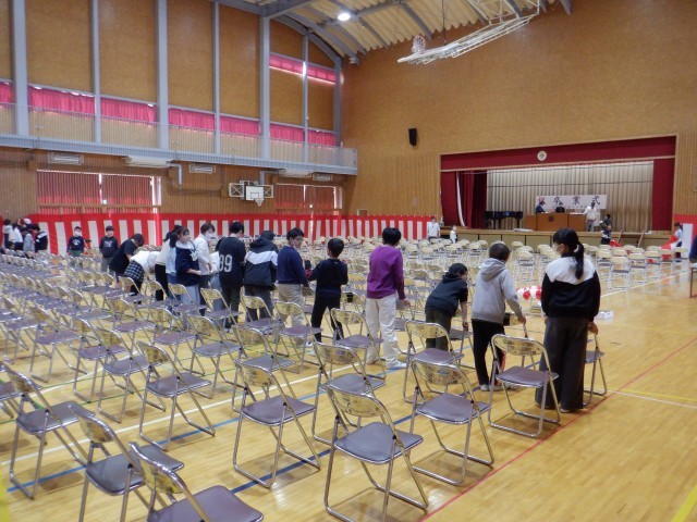 6年生が下校した後、卒業式の会場づくりが始まります。