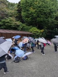 鶴岡八幡宮に全員無事に到着しました。雨の中ですが、記念写真を撮ってから大階段を登...