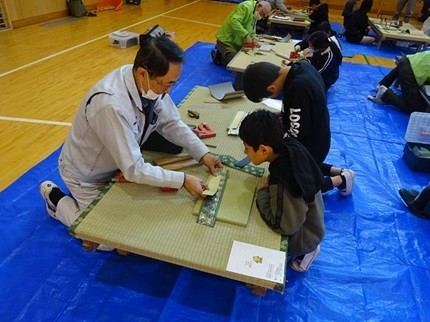 6年生の児童は、「畳」、「印章彫刻」、「和裁」、「左官」の4分野に別れて、それぞれの分野の「技能士」の方にご指導をいただき、ものづくり体験をしました。