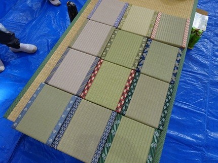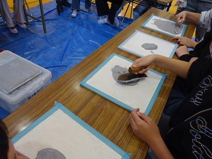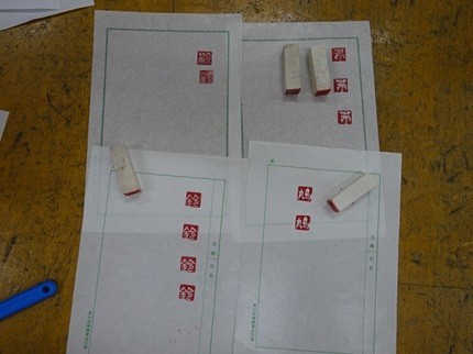 ○写真は実習の様子です。「畳」班は、「ミニ畳づくり」、「印章彫刻」班は「ハンコづくり」、「和裁」班は、「巾着袋づくり」、「左官」班は「壁塗り体験・手形づくり」を、それぞれ行いました。
