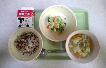 メニューはサンダめし、牛乳、パワーアップサラダ、チキンヌードルスープでした。