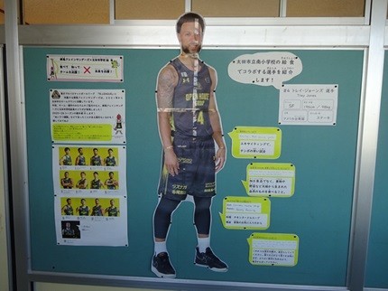 【写真】「わかあゆ教室」の廊下にトレイ・ジョーンズ選手の等身大の写真を、栄養士の先生が貼ってくださいました。南小のみなさんには、ぜひ見てほしいと思います。
