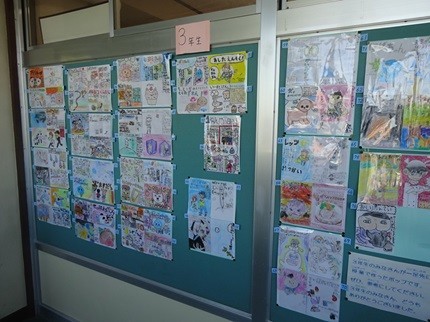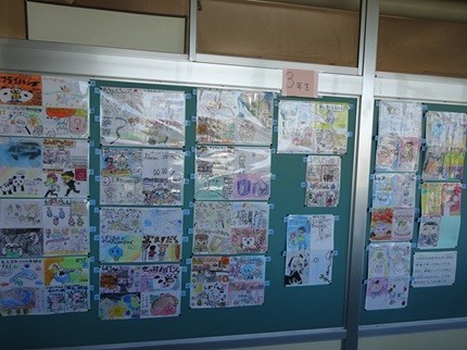 応募総数約240枚。全校児童から寄せられた「自分がオススメしたい本」の紹介が書かれた「メッセージカード」のすべては、図書室の廊下に掲示されています。