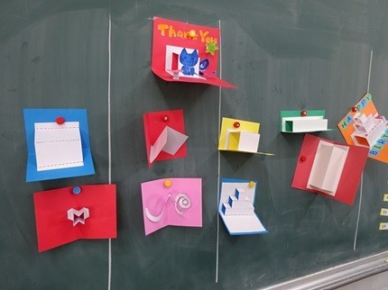 画用紙を組み合わせて、立体的なポストカードを制作していました。開いた瞬間に立体が飛び出すように現れるポストカードには、幸せを運ぶ温かなメッセージが書かれていました。