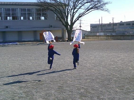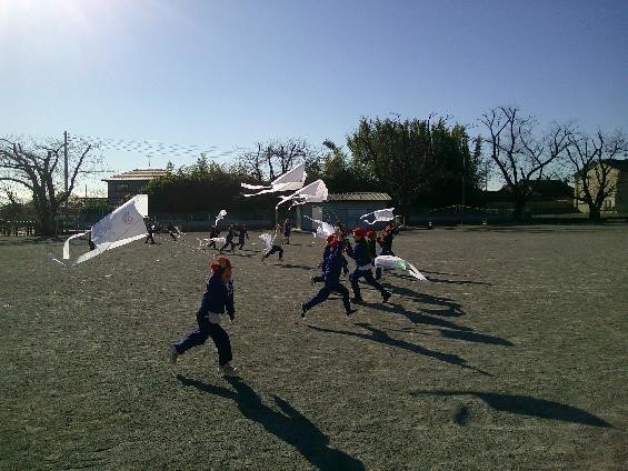 よく晴れて風も穏やかな今日、1年生の生活科では、冬を楽しむたこあげをしました。