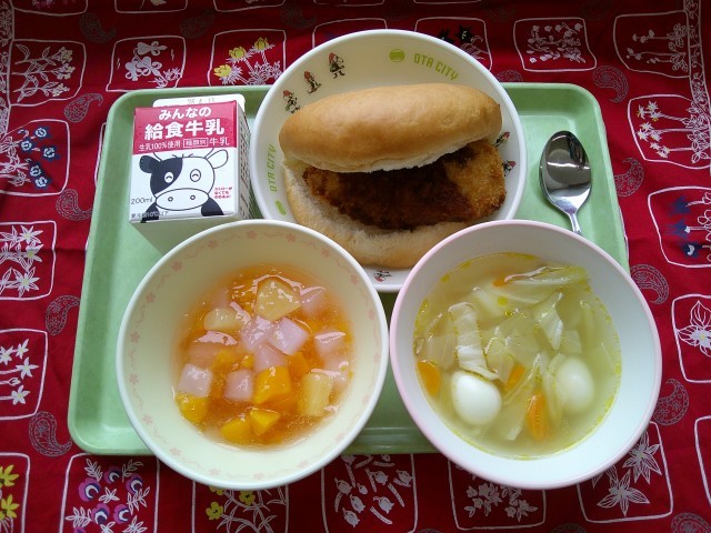 今日の献立は「パーカーハウス 牛乳 白身魚のフライ ABCスープ ゼリーあえ」