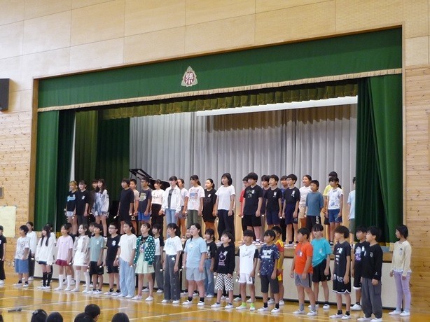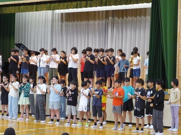 5年生が10/9(木)に市内の小学校音楽発表会で披露するリコーダー奏「人生のメリーゴーランド」と二部合唱「世界がひとつになるまで」を発表しました。全校児童を前に練習の成果を発揮して、一生懸命心のこもった演奏と歌声を聴かせることができました。