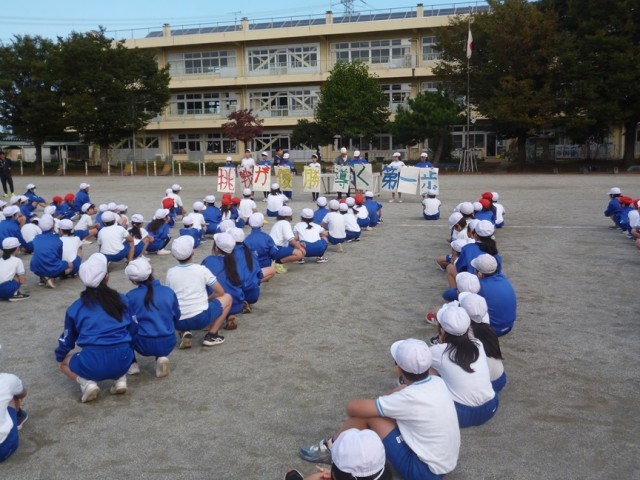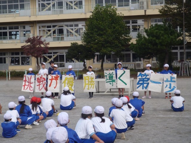 10/23(木)の朝運動は、運動会に向けて団別に整列して、児童から募集したスローガンの発表でした。今年のスローガンは「挑戦が優勝導く第一歩」となりました。