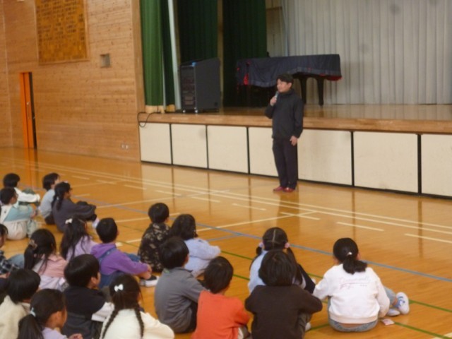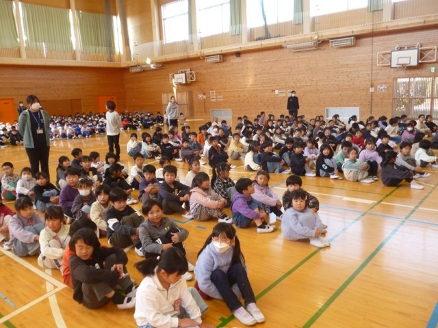 体育館に集合して、最後に太田警察署員さんに不審者に会ったときの対応の仕方や逃げ方などについて話をしていただきました。