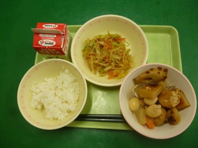 今日の献立は、「うずらの玉子入りおでん・おかか和え・ごはん・牛乳」でした。