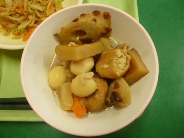 「おでん」は、日本料理の煮物の一種で鍋料理にも分類されるようです。鰹節や昆布でだしに味をつけ、焼ちくわや大根、さつまあげ、こんにゃくなどの具材を長時間煮込みます。地域や家庭によって味付けや具材が違います。給食の「おでん」は、お店とは違って煮込み時間が長くとれないので、しっかりと準備をして1時間で味がしみ込むように工夫をしているそうです。だしもしっかりと取っているそうです。栄養士さんと調理員さんの工夫に感心させられました。