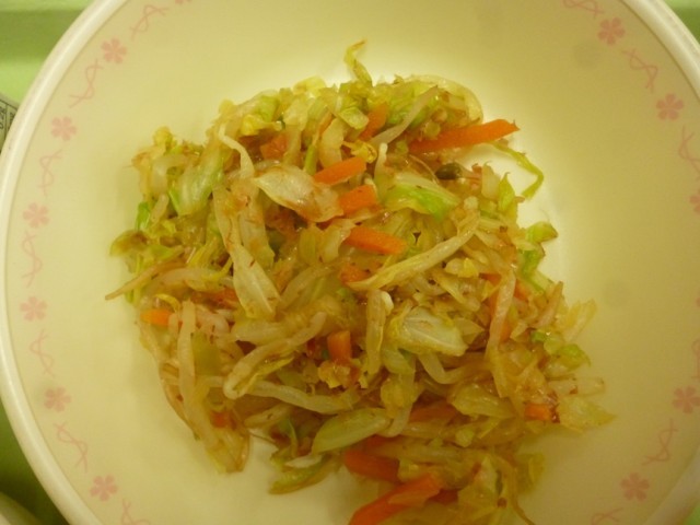 次に、「おかか和え」です。「おかか」とは鰹節を薄く削ったものだそうです。その「おかか」を使って、醤油などで味を付けた和え物のことです。この日は、キャベツ・にんじん・もやしにおかかと醤油・ほんてりを使って味をつけたそうです。