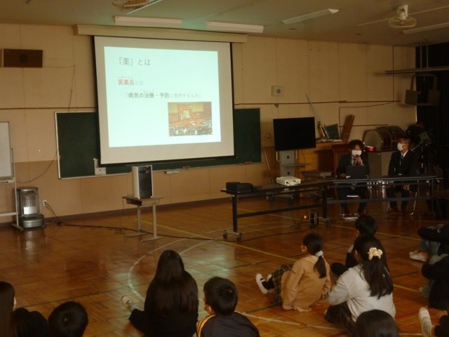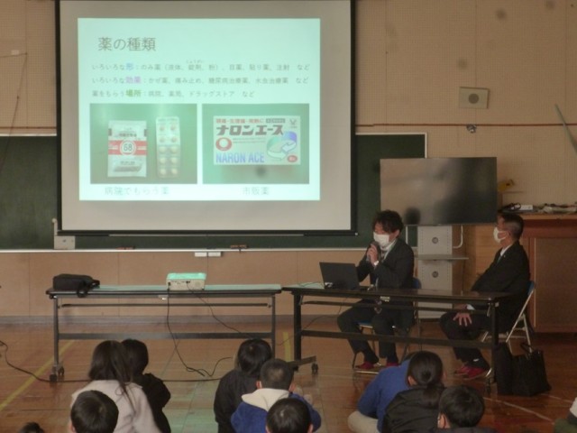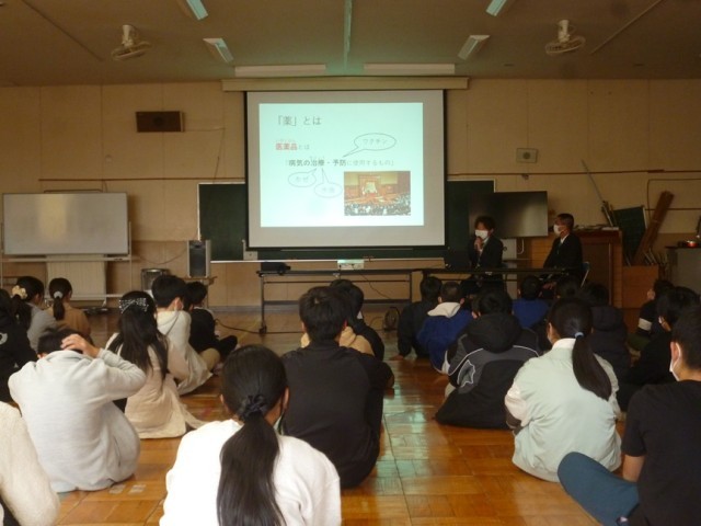 太田保健福祉事務所の職員さんお二人を招いて講演していただきました。スライドを見ながら、喫煙による病気のリスクや周りの人への影響などの資料を示しながらご説明していただきました。そして、薬とはどういうものか、薬の正しい使い方や自分たちを取り巻く危険について分かりやすくお話いただきました。