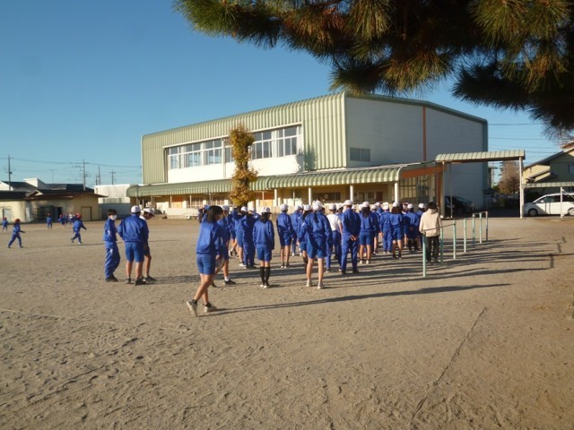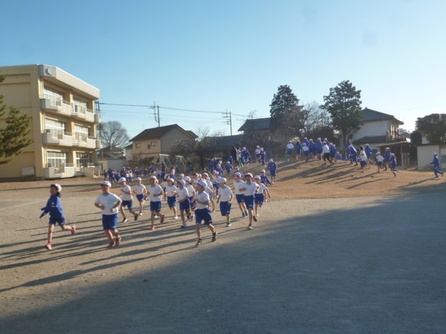 前回、各学年ごとにスタート位置やコース、制限時間などを確認しました。この日は、2回目でスムーズに集合場所に集まり準備体操から始めました。寒い中、6年生はさすがで、一番早く集合して他学年の手本になっていました。